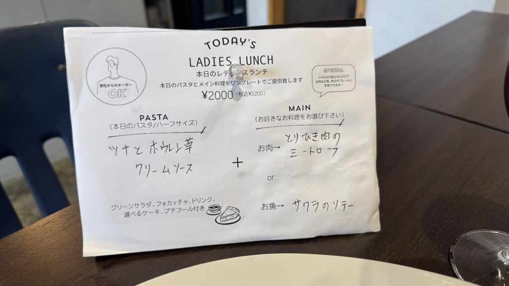 レディースランチは自家製ケーキ、メイン、そしてドリンクを選んで決めるワクワク楽しめるメニューでもあります。