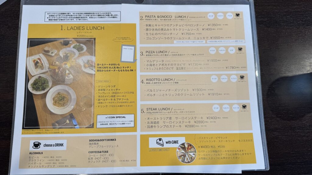 TAKCAFE中央林間、TAKCAFE italian dishes and cakes相模大塚の両店でも、人気NO.1メニューである「レディースランチ」を注文したので、今回は別のランチセットを注文してみました!
